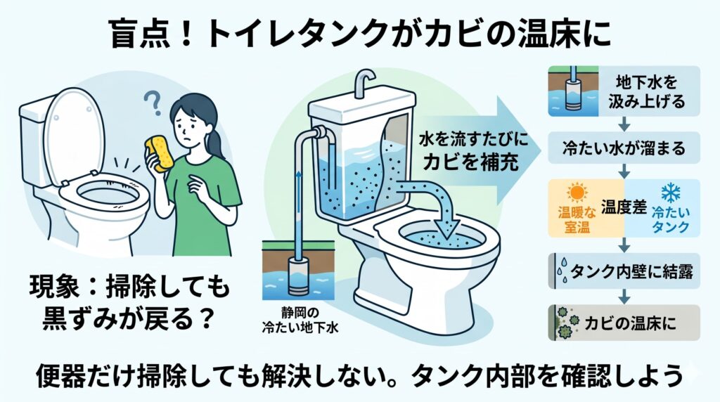 丁寧に掃除しているのに黒ずみがすぐ戻る原因は掃除の方法ではなく、気候・間取り・タンクの状態といった「見えない環境」にあることが多いです。この章では、黒ずみが繰り返す背景にある環境的な要因を整理します。