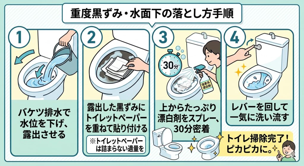 便器の奥底や水面下に広がった黒ずみには、水位を下げてから洗剤を密着させる方法が効果的です。