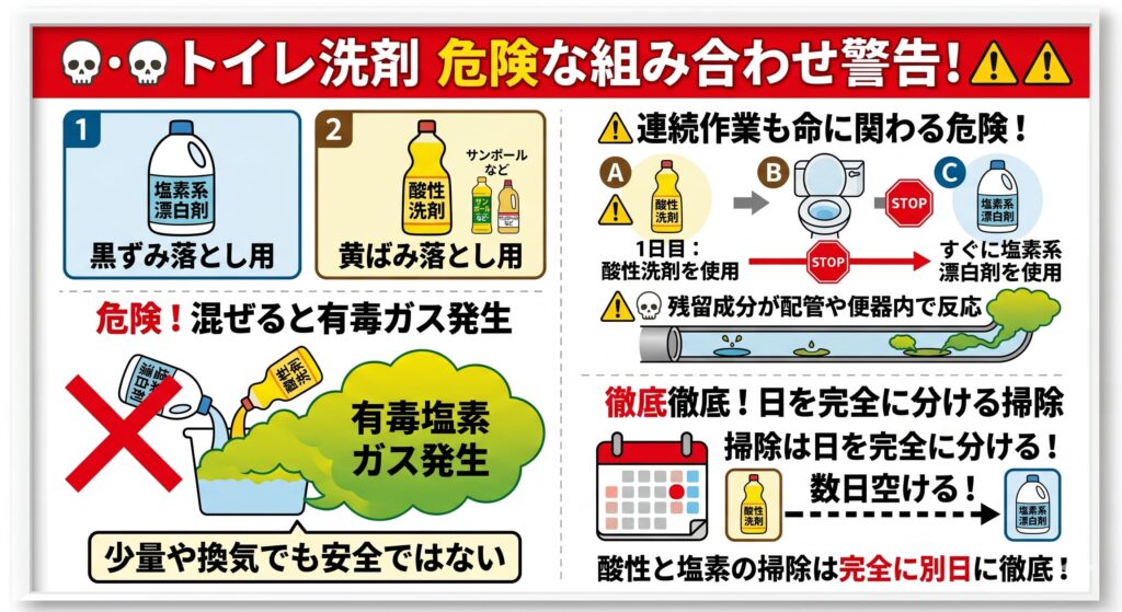 また、「先に酸性洗剤を使って水で流した後すぐに塩素系漂白剤を使う」連続作業も、成分が便器内や配管に残っている可能性があるため危険です。