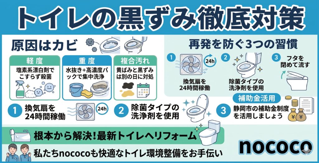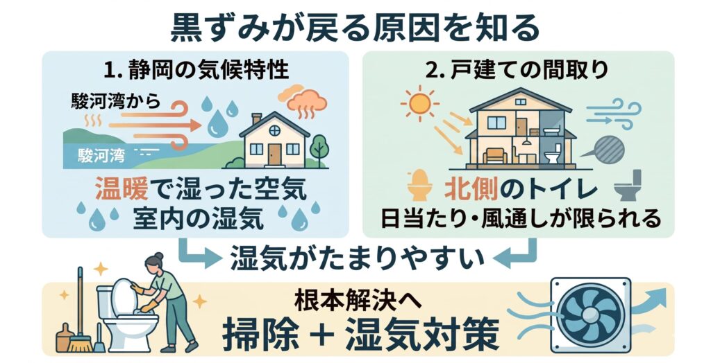 さらに、葵区や駿河区などの昔ながらの戸建て住宅ではトイレが北側に配置されているケースが多く、日当たりや風通しが限られるため湿気がこもりやすい条件が重なりがちです。黒ずみを根本的に防ぐには、掃除と合わせて「湿気対策」を意識することがポイントです。