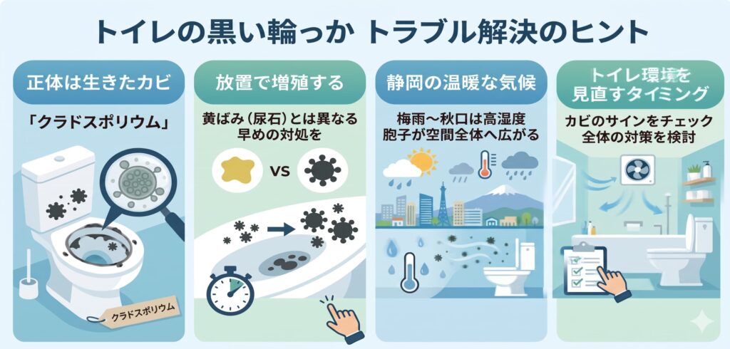 便器のフチや水面付近に現れる黒い輪っかの正体は「クラドスポリウム」という生きたカビです。黄ばみ(尿石)とはまったく異なる汚れで、放置するほど繁殖が進むため早めの対処がおすすめです。