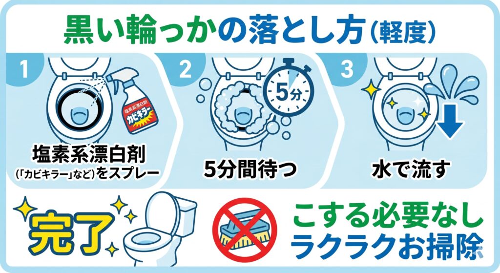 トイレの黒ずみの正体はカビです。軽度なら塩素系漂白剤でこすらず殺菌、重度なら水抜き+高濃度パックで対処できます。黄ばみとの複合汚れには、両方を別の日に対処することが大切です。
