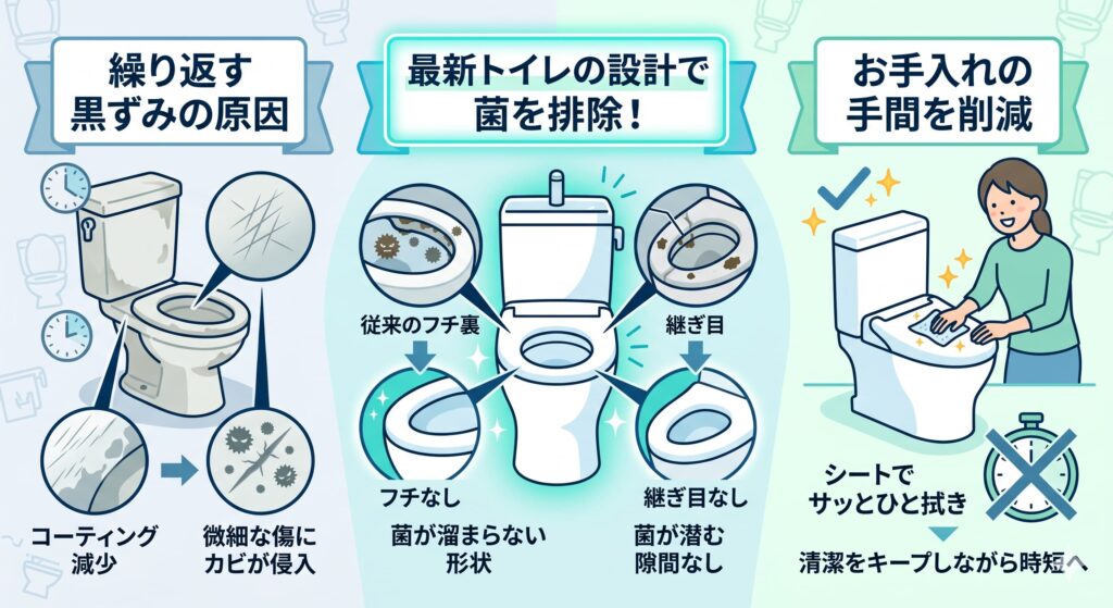 「トイレ掃除をしているのに、黒い汚れがなかなか消えない」というお悩みはありませんか?実は、トイレの黒ずみは普通の汚れとは異なり、生きたカビが原因です。正しく理解することが、清潔で安心なトイレ環境への第一歩です。この章では、黒ずみの正体・健康リスク・黄ばみとの複合汚れという3つの視点からわかりやすく解説します。