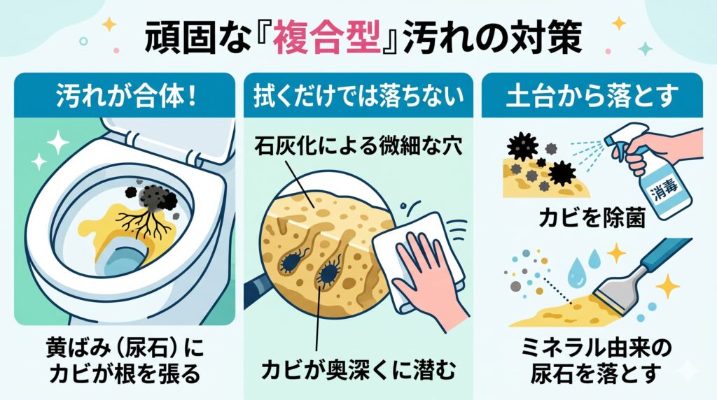 黒ずみをこすっても落ちない場合、黒カビ単体ではなく黄ばみ(尿石)と合体した「複合型の汚れ」になっている可能性があります。石灰化した尿石の表面には微細な穴があり、その奥深くにカビが根を張ってしまうと、表面を拭くだけでは根本的な解決になりません。