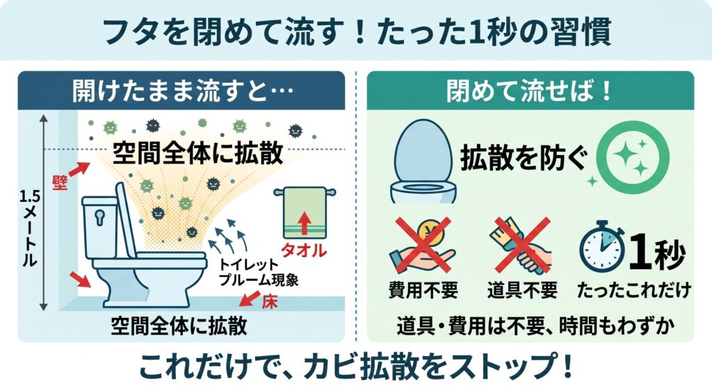 フタを開けたまま水を流すと、「トイレットプルーム」と呼ばれる現象で目に見えない細かな水しぶきが高さ1.5メートル付近まで舞い上がります。その中にはカビの胞子や雑菌が含まれており、壁・床・タオルなどに付着してトイレ空間全体にカビが広がる原因になります。水を流す前にフタを閉めるだけで、これを防ぐことができます。道具も費用もかからず、かかる時間はたった1秒です。