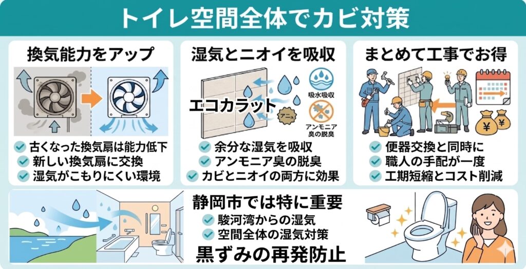 駿河湾からの湿気が入りやすい静岡市では、空間全体の湿気対策が特に大切です。便器交換と同時に換気扇・壁材の工事を行えば、職人の手配が一度で済み、工期の短縮とコスト削減にもつながります。