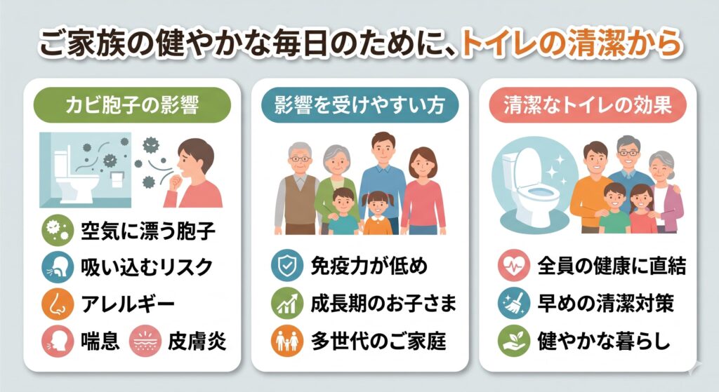 カビの胞子が空気中に漂い、それを吸い込むことでアレルギー性鼻炎・気管支喘息・皮膚炎などのリスクが高まるとされています。健康な大人への影響は軽微でも、免疫力が低めのご高齢の方や成長期のお子さまにとっては、毎日使うトイレ空間が体調に関わることもあります。