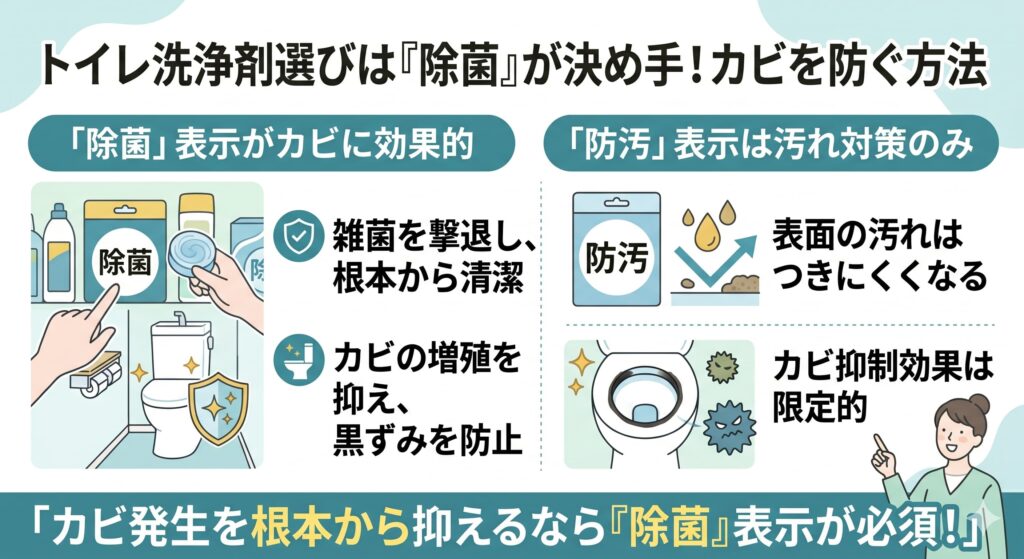 トイレ用スタンプや置き型洗浄剤を選ぶなら、パッケージに「除菌」と明記されているものを選ぶことがポイントです。「防汚」タイプは汚れをつきにくくする効果に優れていますが、カビの増殖を抑える働きはあまり期待できません。「除菌」タイプはカビの栄養源となる雑菌にアプローチするため、黒い輪っかの発生抑制に効果的です。