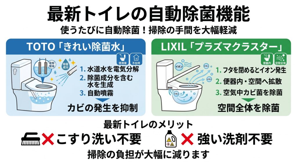 最新トイレは、使うたびに自動で除菌してくれる時代になっています。