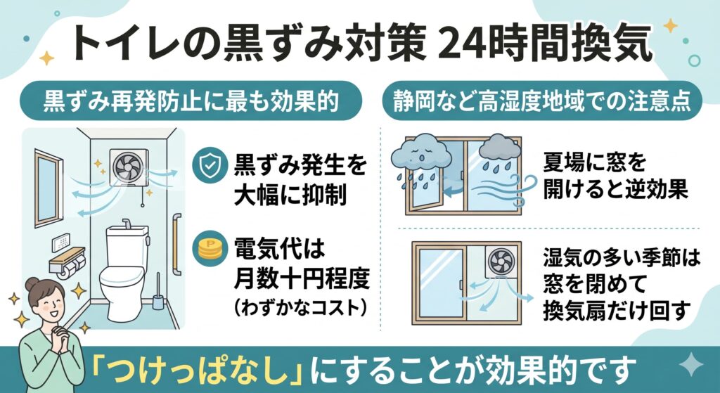 黒ずみの再発防止に最も効果的なのが、換気扇を24時間回し続けることです。トイレの換気扇の24時間稼働にかかる電気代は月に数十円程度。このわずかなコストで黒ずみの発生を大幅に抑えられます。