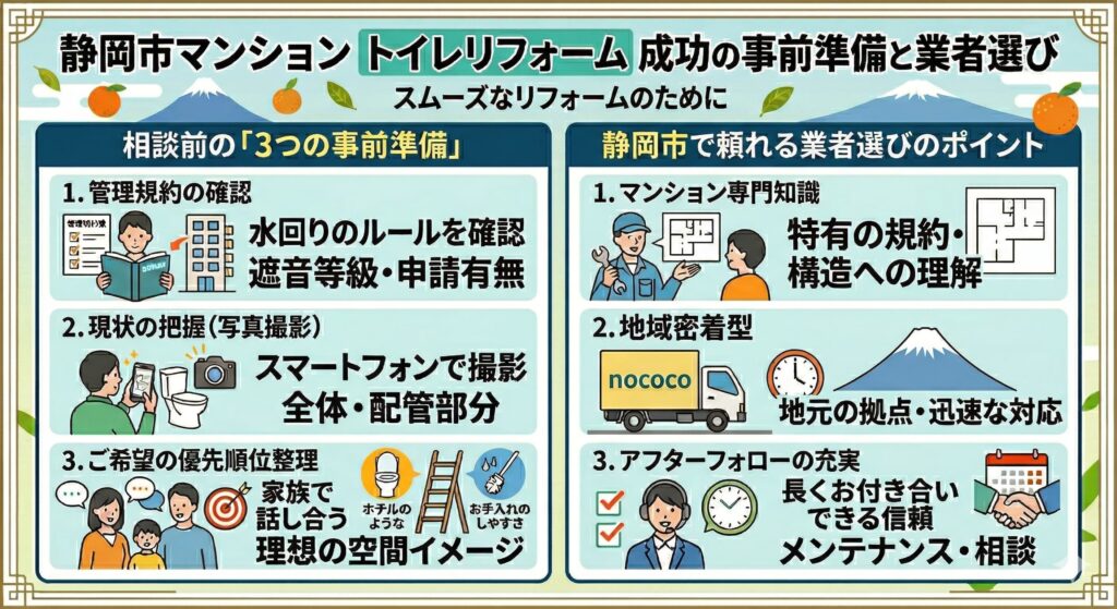 静岡市のマンションでトイレリフォームをご検討中の方にとって、業者への相談をスムーズに進めるための事前準備と、信頼できる業者の見つけ方は、リフォーム成功の大きなポイントです。マンションならではの規約や構造の特性をよく理解した業者と出会うことで、理想のトイレ空間への道のりが格段に近づきます。本章では、相談前に整えておきたい準備と、静岡市で頼れる業者を見極めるポイントをご紹介します。