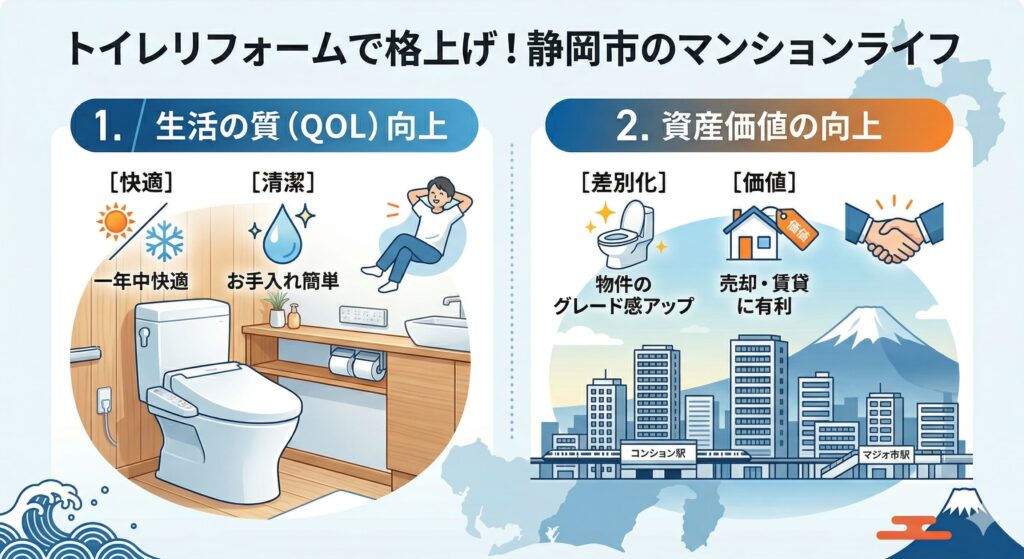 本章では、最新のトイレリフォームが静岡市でのマンションライフにもたらす2つのメリットをわかりやすく解説します。