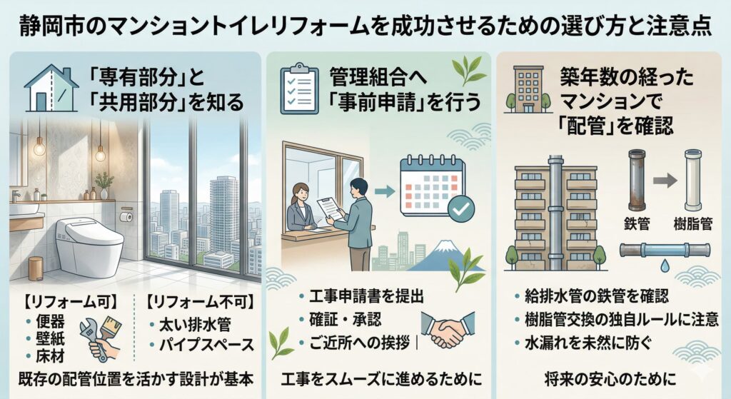 静岡市のマンションにお住まいの方やオーナーの方にとって、理想のトイレ空間のイメージが固まったら、次に大切なのが「マンションならではのルール」の確認です。マンションのリフォームは、戸建てとは異なり、管理規約や管理組合への申請が必要になる場合があります。事前にポイントを押さえておくことで、安心してリフォームを進めることができます。ここでは、スムーズなリフォームのために知っておきたい3つの確認ポイントをご紹介します。