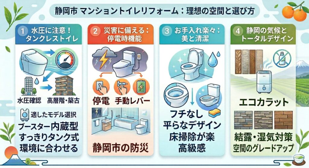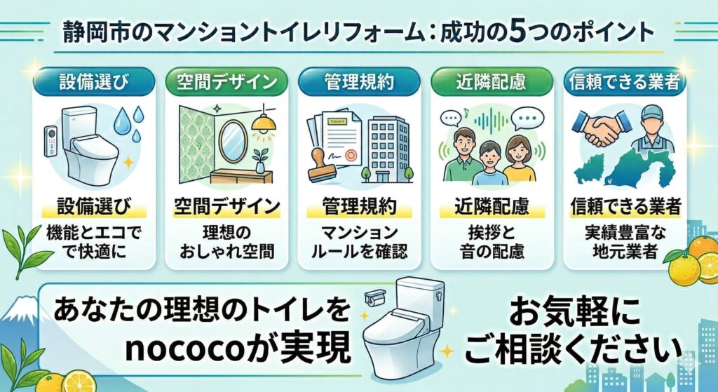 本記事では、静岡市のマンショントイレリフォームを成功させるための5つのポイントをご紹介しました。