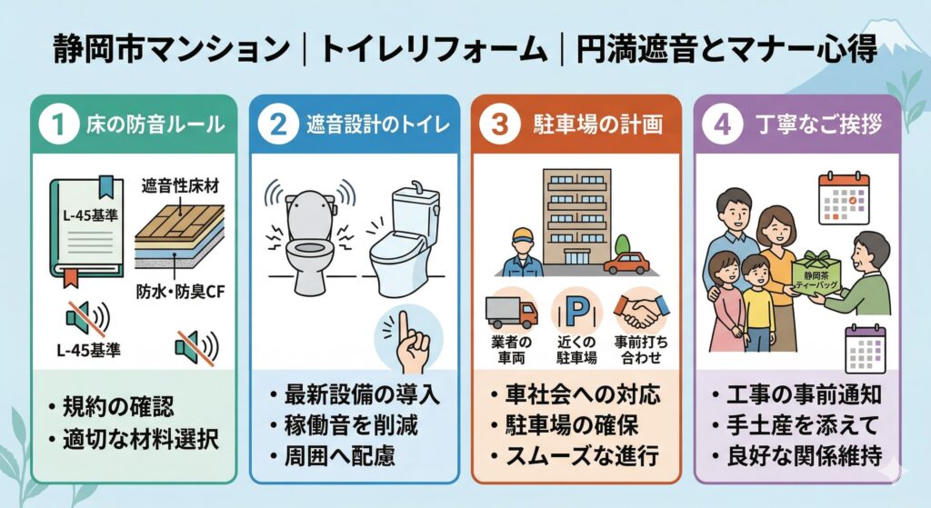 静岡市のマンションでトイレリフォームを進めるうえで、設備選びと同じくらい大切なのが、周囲への配慮です。マンションという共同住宅では、工事中の音や業者の出入りが近隣の方に影響することもあります。しかし、事前にしっかりと準備と配慮を整えておくことで、ご近所の方と良好な関係を保ちながら、気持ちよくリフォームを進めることができます。ここでは、円満なリフォームのために押さえておきたい4つのポイントをご紹介します。