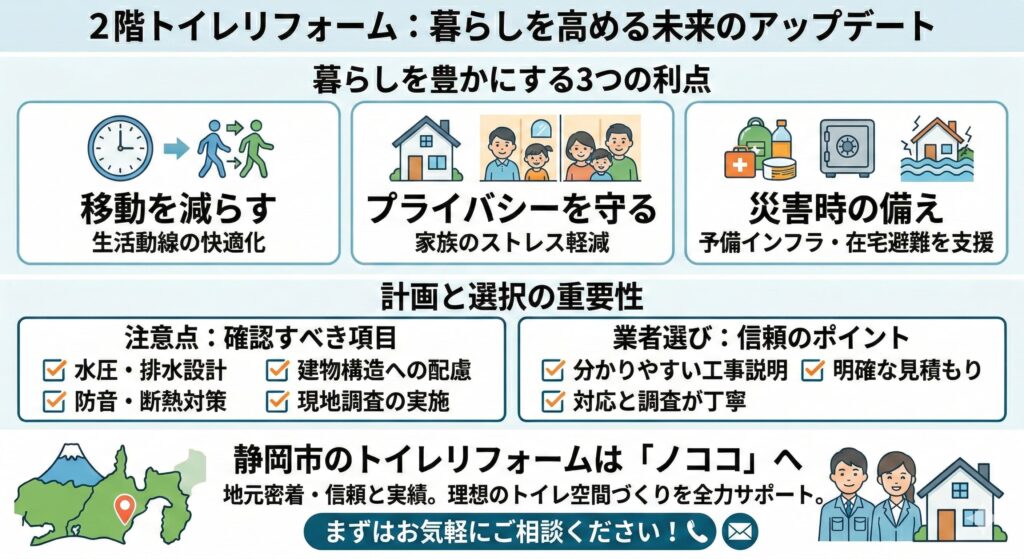 この章では、静岡市で暮らすからこそ知っておきたい、2階トイレの具体的なメリットをわかりやすく解説していきます。