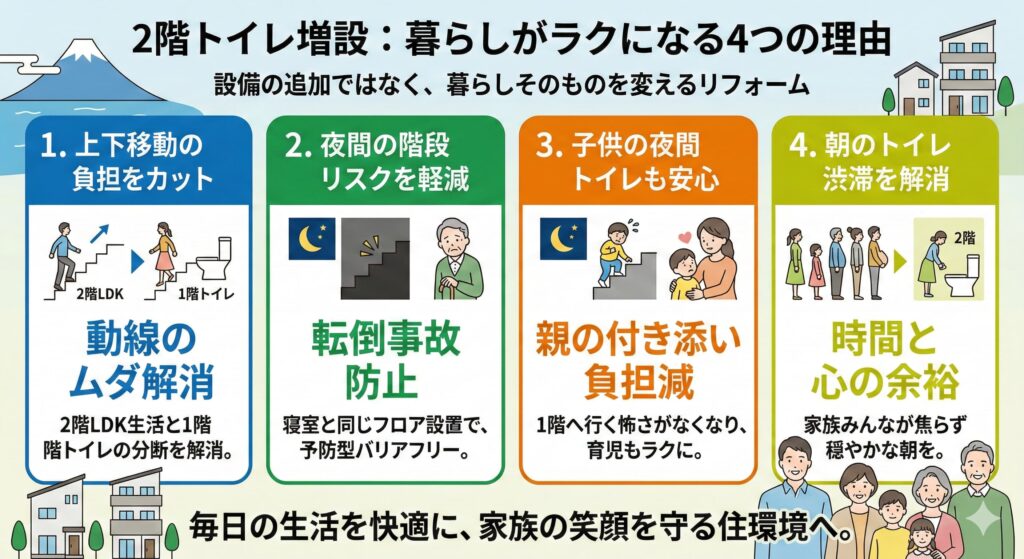 2階トイレの増設は、快適性・安全性・将来性を同時に高めるリフォームなのです。