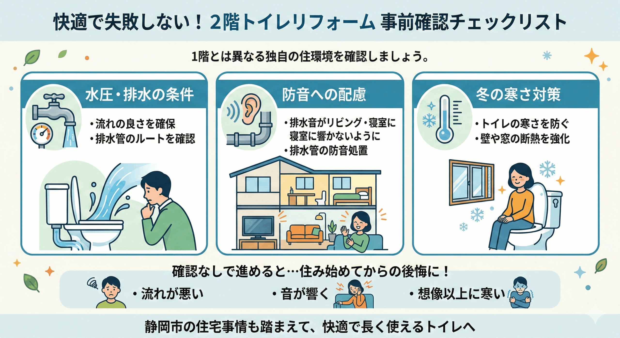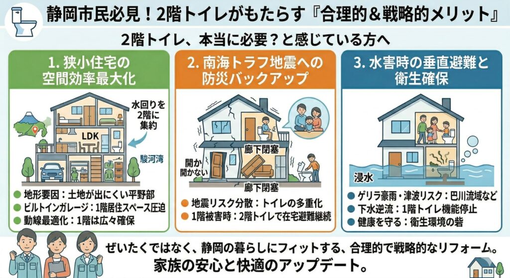 特に住宅が密集し、3階建て住宅や二世帯住宅も多い静岡市では、生活動線を考えたトイレ配置が暮らしやすさに大きく影響します。