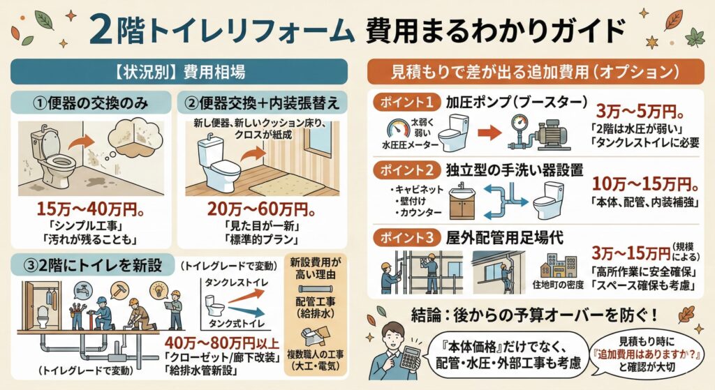 その理由は、見積もりの段階では含まれていない追加設備や工事費が発生することがあるためです。特に2階トイレでは、次のような費用が追加されることがあります。