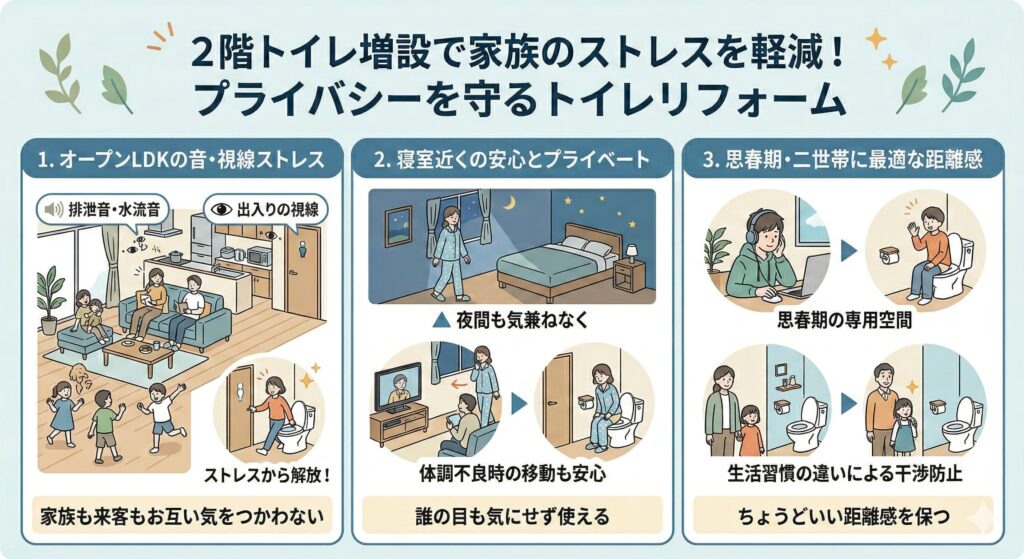 トイレ増設は単なる設備工事ではありません。家族の時間と心の余裕を買うリフォームなのです。