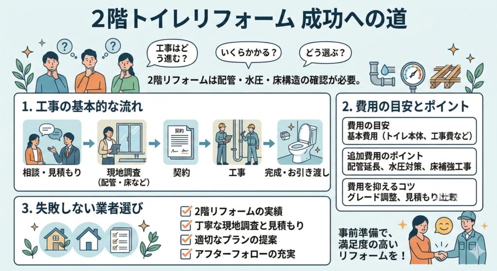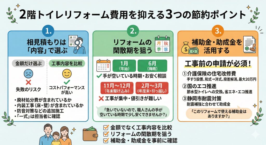 2階トイレのリフォーム費用を抑えるためには、次の3つが重要です。
