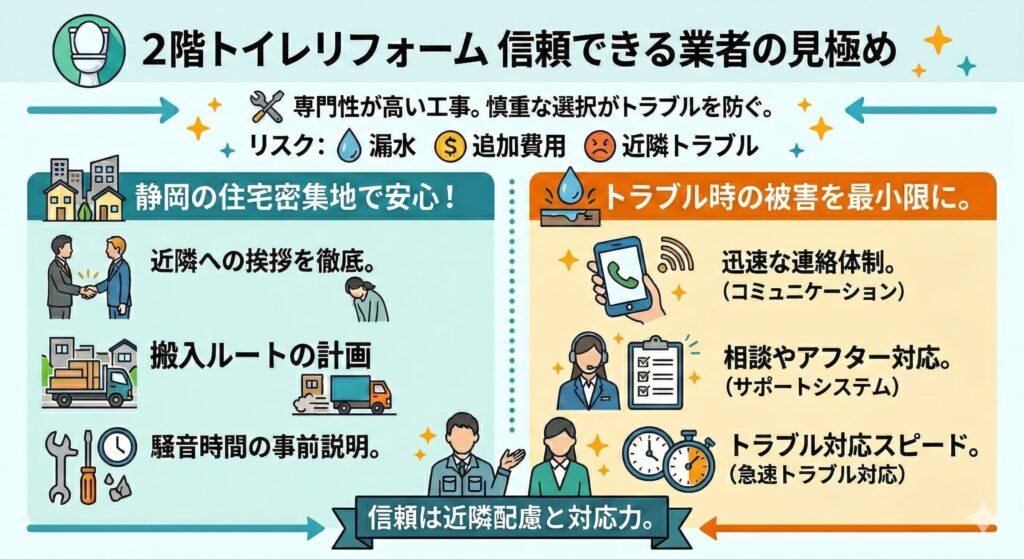 ここでは、静岡市で2階トイレリフォームを依頼する際に知っておきたい業者選びのポイントを紹介します。