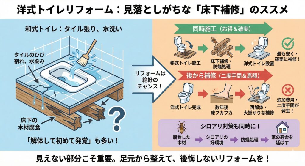 実は、和式から洋式へのリフォームで最も見落とされがちなのが「床下の状態」です。