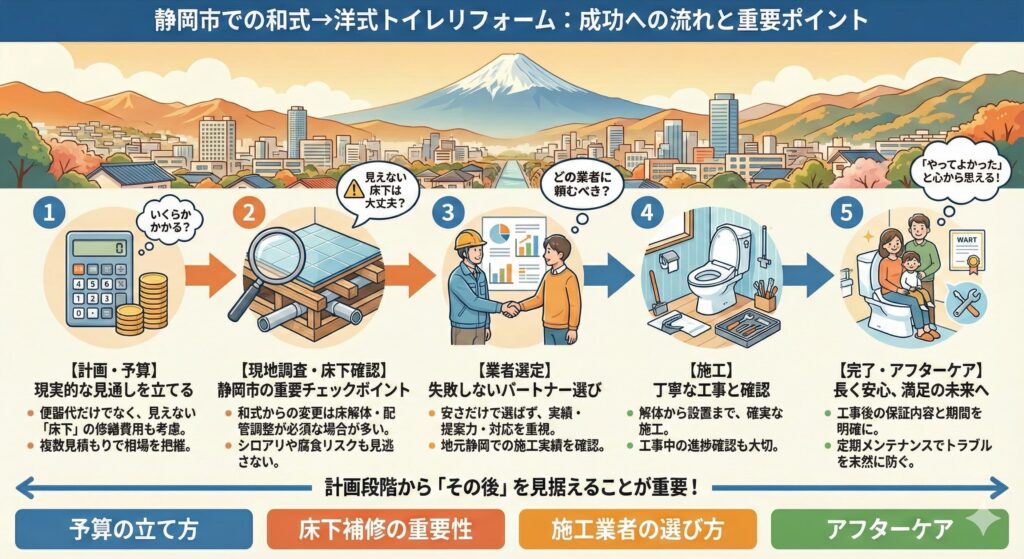特に静岡市のように築年数の経った住宅が多い地域では、「便器の交換」だけでなく、床下や配管まで含めた総合的な見直しが重要になります。