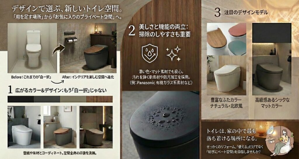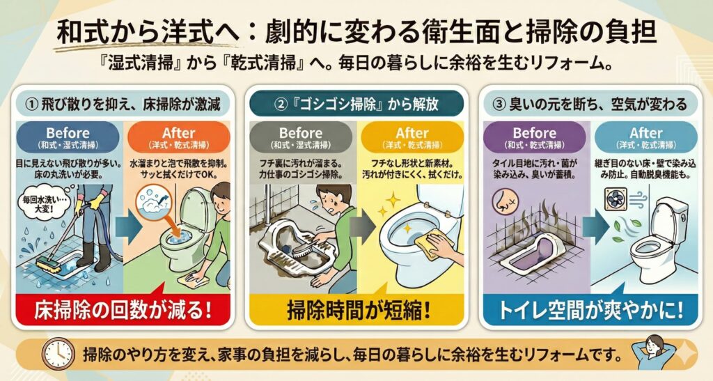 洋式トイレへのリフォームは、湿式掃除の前提そのものを「サッと拭くだけで済む乾式清掃」へ切り替えることでもあります。