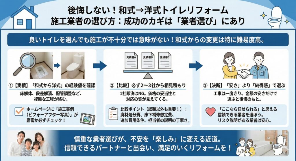 業者選びを慎重にすることが後悔しないトイレリフォームへの近道です。