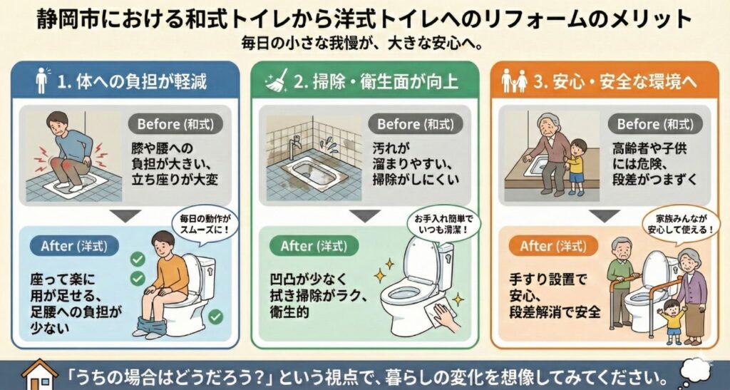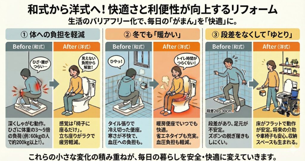 ここでは、和式から洋式に変えることで実感しやすい3つの大きな変化をご紹介します。
