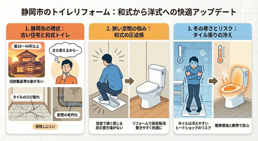 静岡市には築30年以上の住宅も多く、和式トイレが残っているご家庭は決してめずらしくありません。しかし、ひざや腰への負担、冬の寒さ、掃除の大変さなど、日々の小さな我慢が少しずつ積み重なっているケースも多いのが現実です。