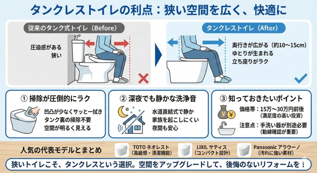 最近は奥行きの短いコンパクトな洋式トイレやタンクレスタイプも増えており、「狭いから無理」と諦めていた方ほど、変化を実感しやすいポイントです。