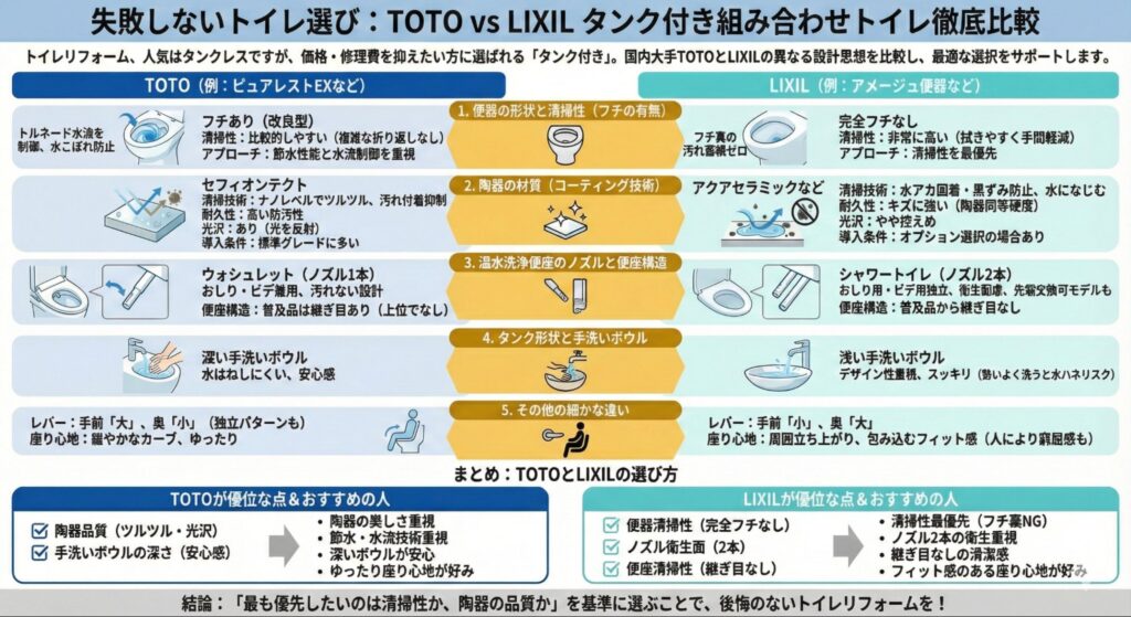 TOTOとLIXILのタンク付き組み合わせトイレは、それぞれが持つ強みと設計思想が明確に分かれています。
