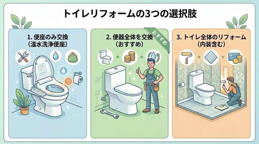 リフォームの範囲は、現状の不満点や予算に合わせて柔軟に選択可能です。ここでは、代表的な3つのパターンとその特徴を整理していきましょう。